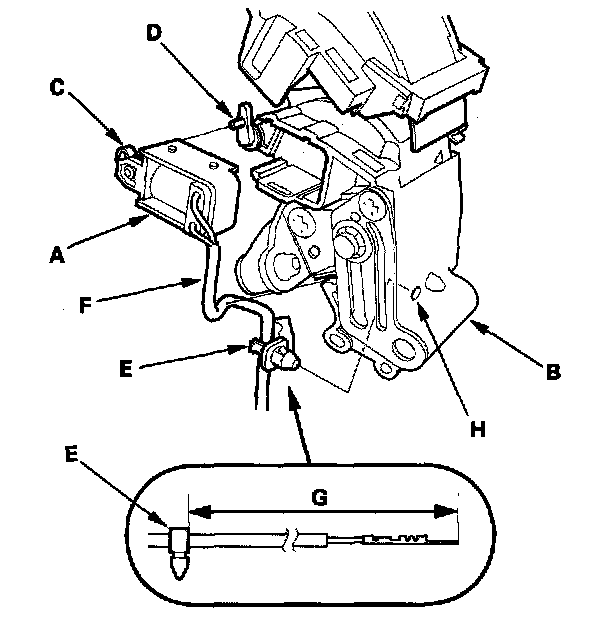 12. Install the harness clamp (E) on the shift lock solenoid harness (F) at 128 - 138 mm (5.0 - 5.4 inch) (G) from the harness terminal end.