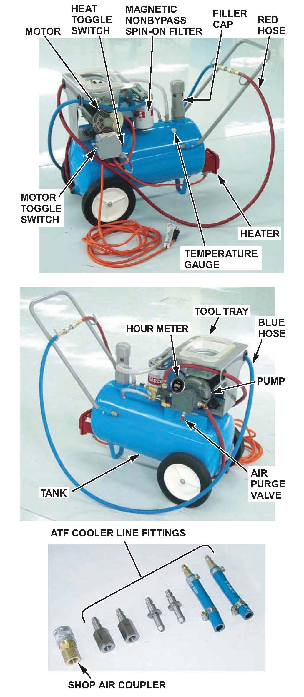 ^ Heats ATF to a temperature of 140° to 150°F and then pumps it through the ATF cooler at high pressure (100 psi) using a pulsating action and air purging. Switching the hoses cleans the ATF cooler in the reverse direction.