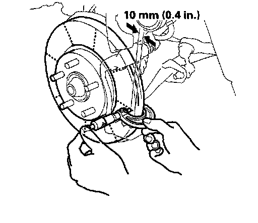 5. Set up the dial gauge against the brake disc as shown, and measure the runout at 10 mm (0.4 inch) from the outer edge of the disc.