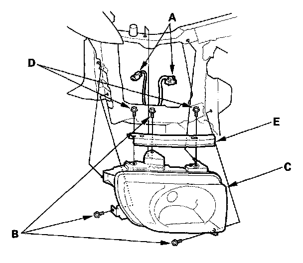3. Remove the three mounting bolts (B) and headlight assembly (C).