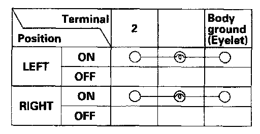 5. Check for continuity between the terminals in each switch position according to the table and the left mounting screw eyelet (D).