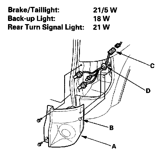 5. If necessary, disconnect the 5P connector (C), and remove the taillight harness grommet (D) from the body.