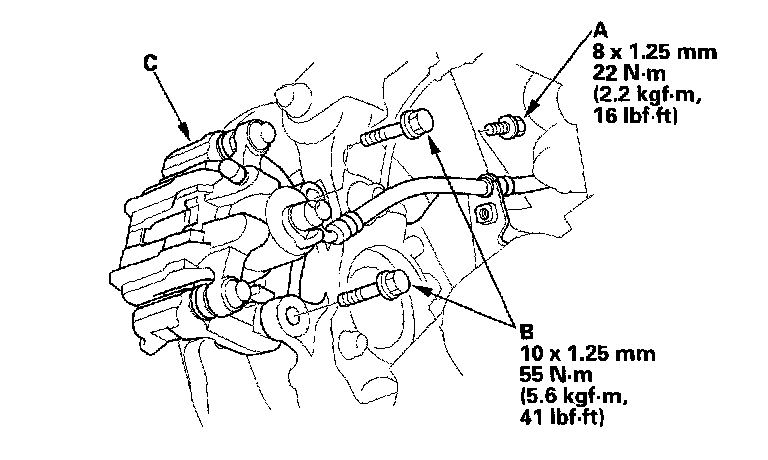 4. Remove the caliper bracket mounting bolts (B), and hang the caliper (C) to one side. To prevent damage to the caliper or brake hose, use a short piece of wire to hang the caliper from the undercarriage.