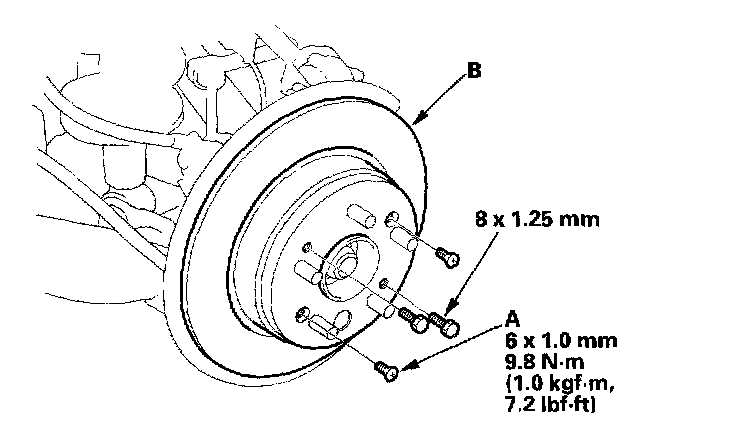 5. Remove the brake disc retaining flat screw (A), and screw two 8 x 1.25 mm bolts into the brake disc/drum (B) to push it away from the hub. Turn each bolt two turns at a time to prevent cocking the brake disc/drum excessively. Remove the brake disc/drum.