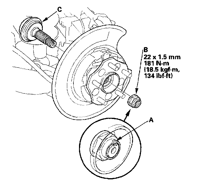 6. Raise the stake (A) of the spindle nut (B), then remove and discard the nut. Remove the rear axle shaft (C) from vehicles with 4WD.