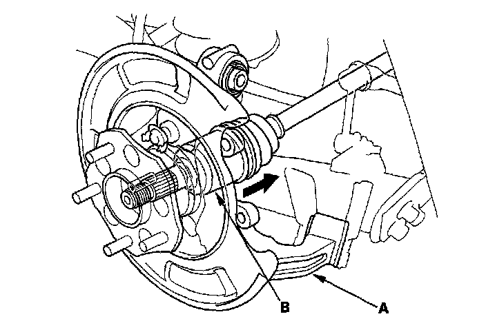 14. Remove the knuckle (A) while pushing in the driveshaft and holding the driveshaft outboard joint (B) (4WD only).