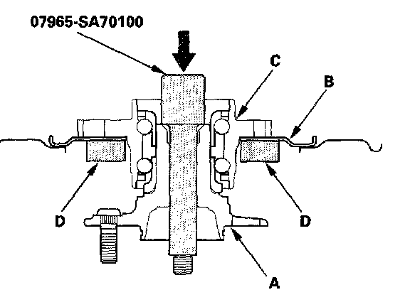 3. Separate the hub (A) and backing plate (B) from bearing unit (C) using the special tool and a hydraulic press. Hold the bearing unit with a press attachment (D) or equivalent tool. Be careful not to deform the backing plate. Hold onto the hub to keep it from falling when pressed clear.