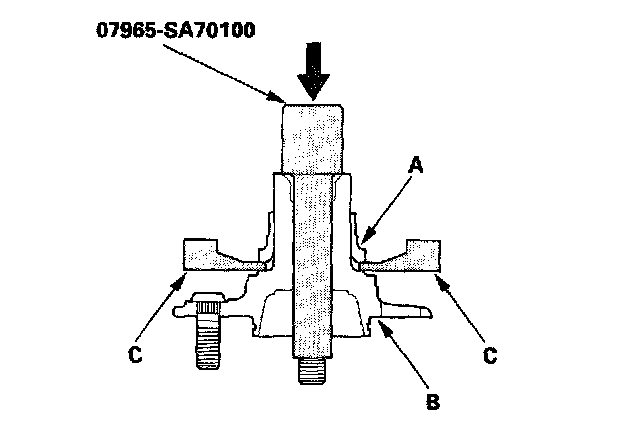6. Install the hub (A) and backing plate (B) on the new bearing unit (c) using the special tools and a hydraulic press. Be careful not to deform the backing plate.