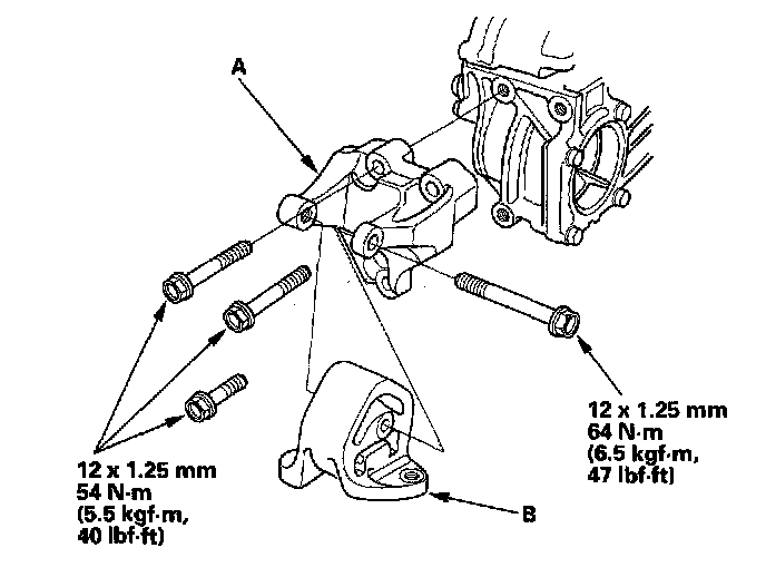 3. Install the transmission rear mount bracket (A) and the transmission rear mount (B).
