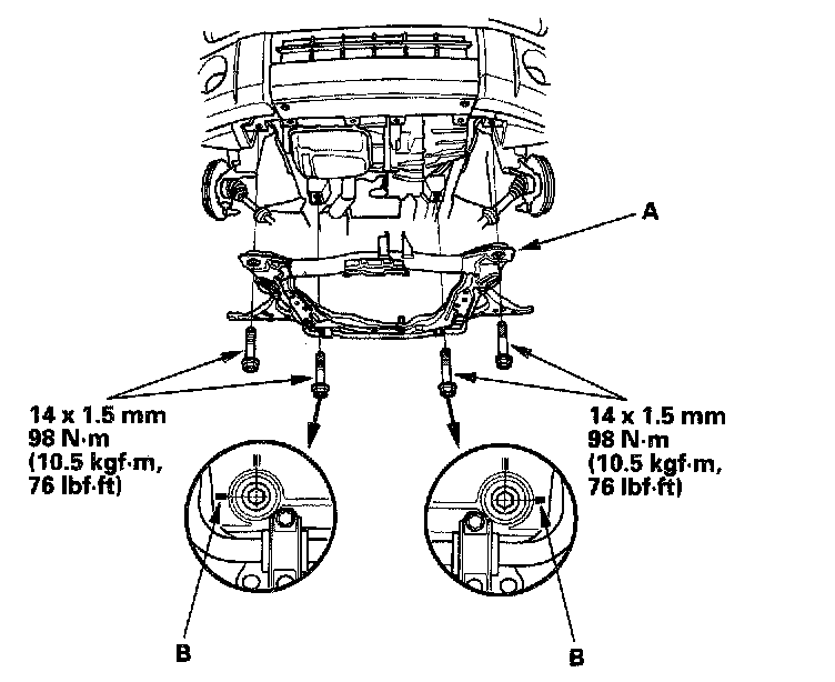 9. Install the front suspension subframe (A) in its original position by aligning the marks (B) you made in the removal procedure.