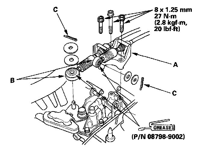 2. Apply super high temp urea grease (P/N 08798-9002) to the release fork (A) and the release bearing (B). Install the release fork, the release bearing, and the boot (C).