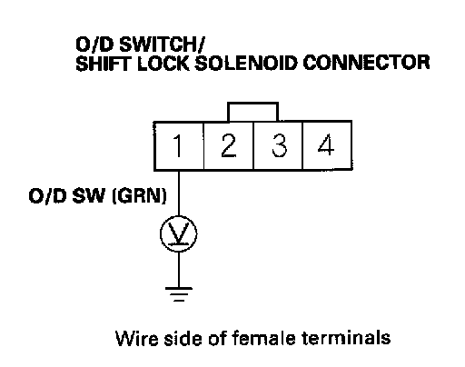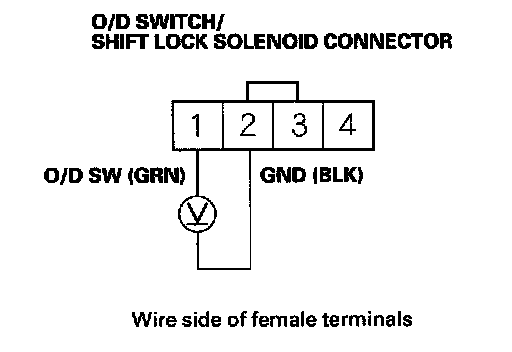 7. Measure the voltage between O/D switch/shift lock solenoid connector terminal No. 1 and body ground.