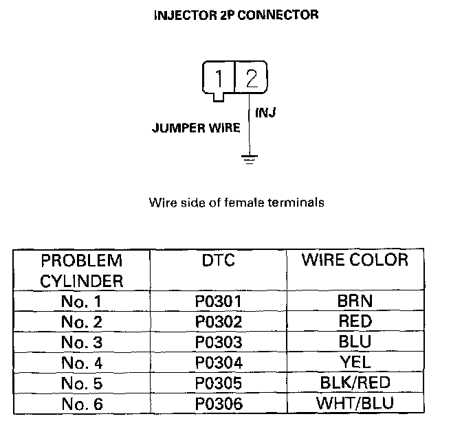 49. Connect the appropriate injector 2P connector terminal No.2 to body ground with a jumper wire (see table).