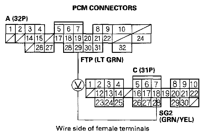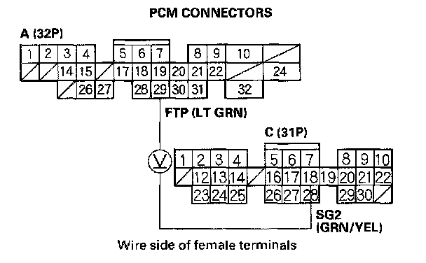 3. Monitor the FTP sensor voltage with the Honda PGM Tester, or measure voltage between PCM connector terminals A29 and C18.