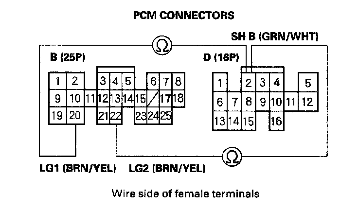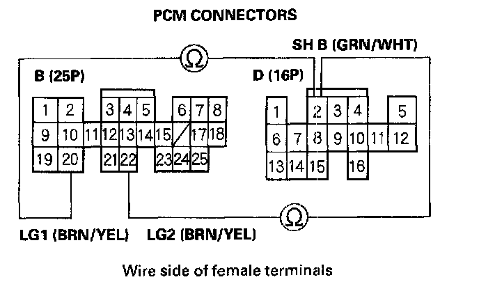 6. Measure the resistance between PCM connector terminals D2 and B20 or B22.