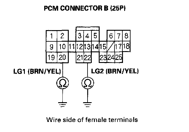 7. Check for continuity between PCM connector terminal B20 and body ground, and between B22 and body ground.