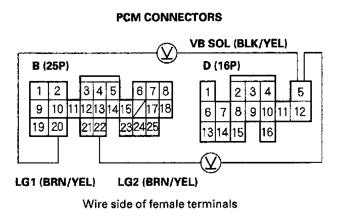 12. Measure the voltage between PCM connector terminals D5 and B20 or B22.
