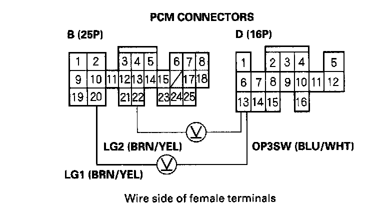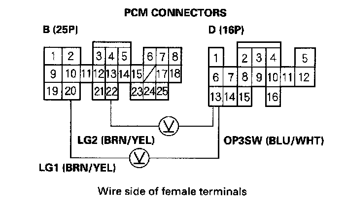 2. Measure the voltage between PCM connector terminals D13 and B20 or B22.