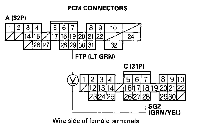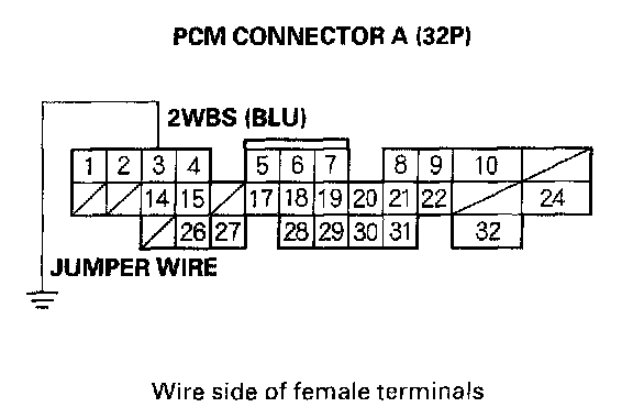 5. Turn the EVAP bypass solenoid valve on with the Honda PGM Tester, or connect PCM connector terminal A3 to body ground with a jumper wire.