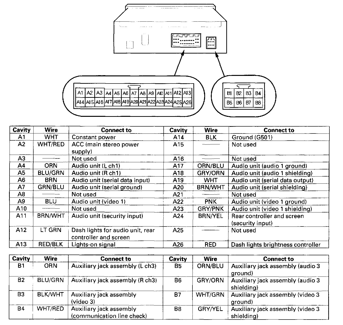 unit connector, match the wires to the cavities listed in the table.