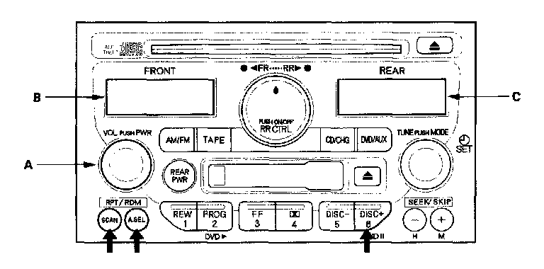4. Release the buttons when a diagnosis message (DIAG) shows in the "FRONT" display (B) and diagnosis indiction shows in the "REAR" display (C) of the audio unit. It changes every 3 seconds for the DVD player unit (DVD), the rear control and screen (DISP), and auxiliary (AUX).