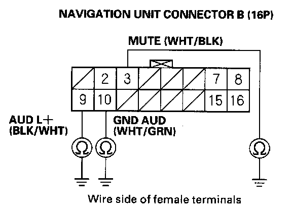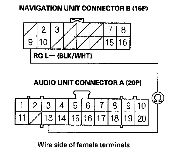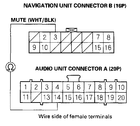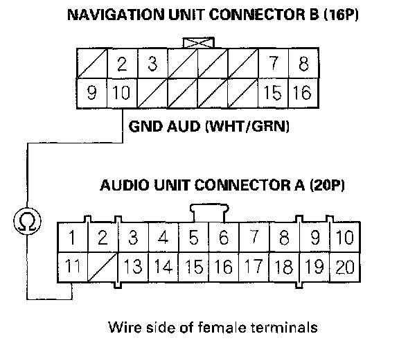 7. Check for continuity between navigation unit connector B (16P) terminal No. 3 and the audio unit connector A (20P) terminal No. 14.