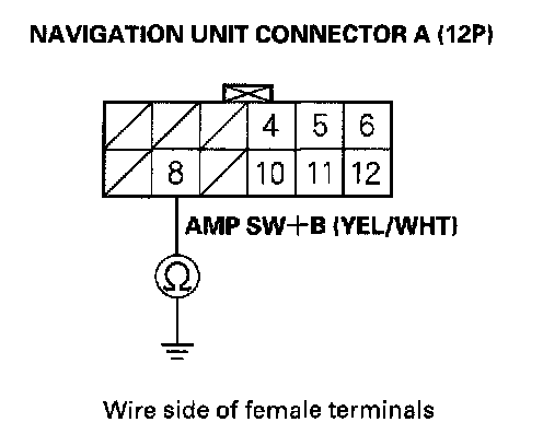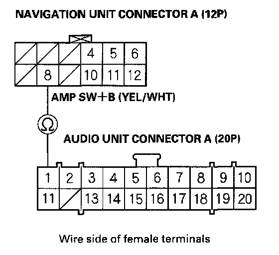 11. Check for continuity between navigation unit connector A (12P) terminal No. 8 and the audio unit connector A (20P) terminal No. 1.