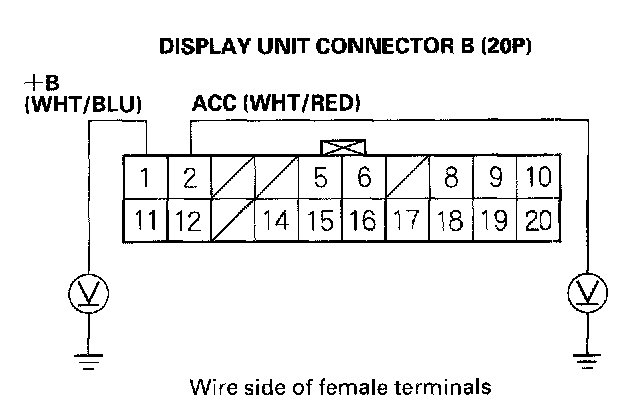 2. Measure the voltage between body ground and display unit connector B (20P) terminal No. 1 and No. 2 individually.
