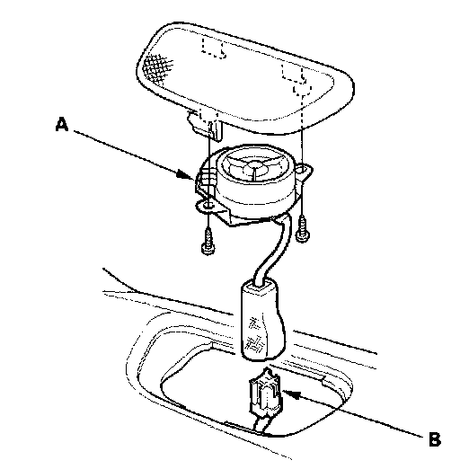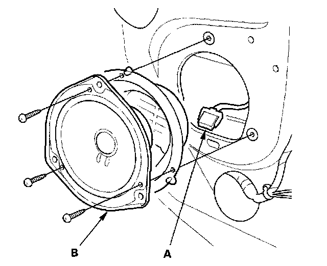 1. Carefully pry the tweeter (A) out of the dashboard, then disconnect the 2P connector (B) from the tweeter.