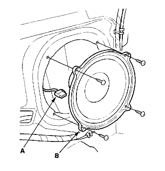 2. Remove the four mounting screws, then disconnect the 2P connector (A) from the woofer (B).