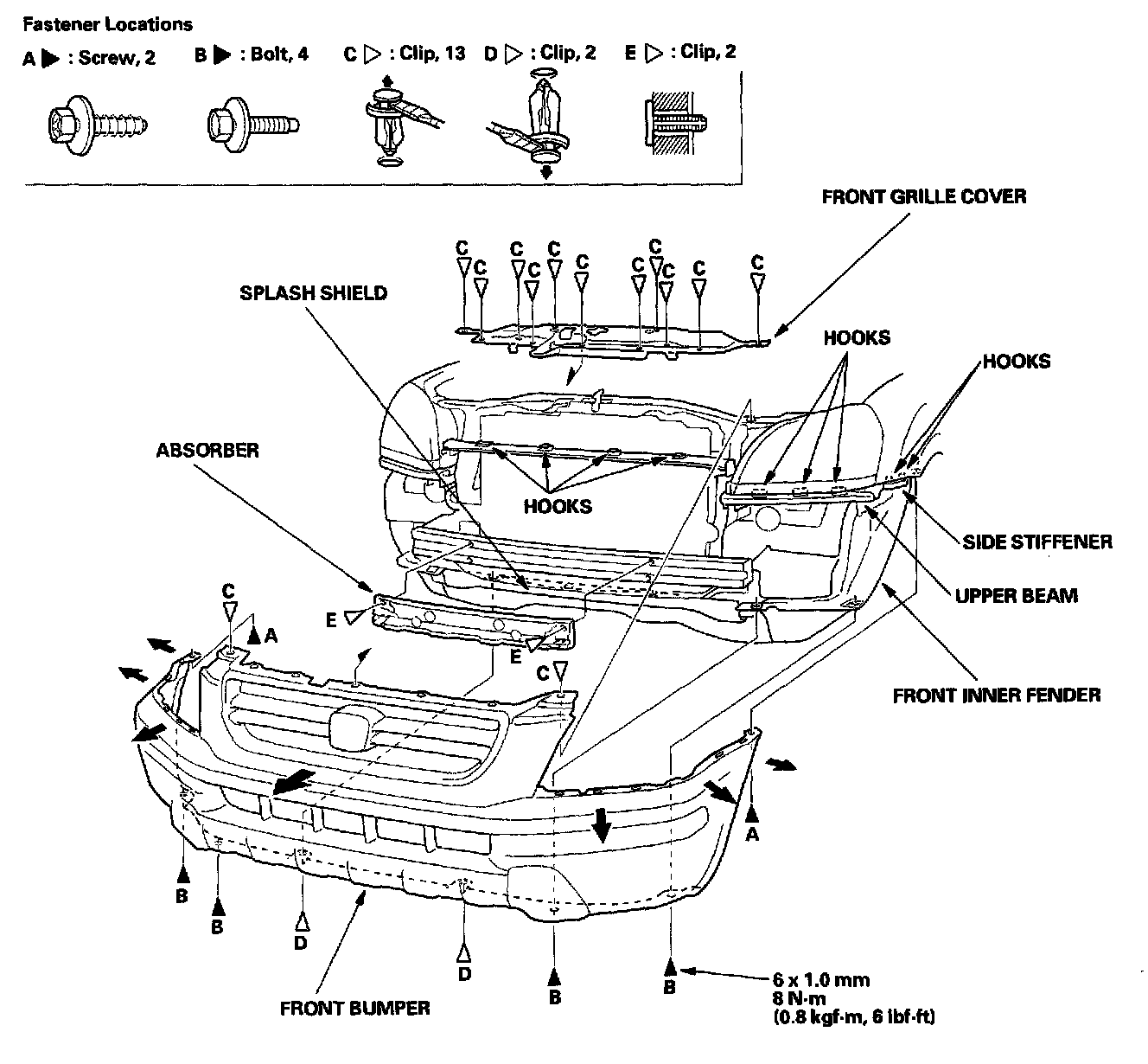 - Make sure the front bumper engages the hooks on both side stiffeners, the corner upper beams, and the center upper beam securely.