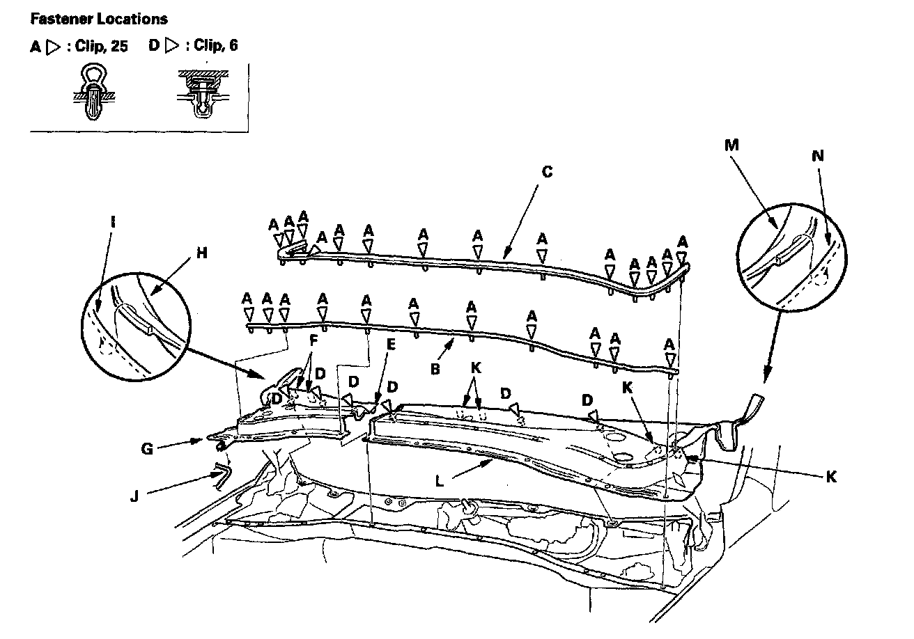 4. Detach the clips (0), and release the hooks (K) by carefully pulling the driver's cowl cover (L) upward. Pull the hinge cover (M) out from the front fender (N), then remove the cover. Take care not to scratch the body.