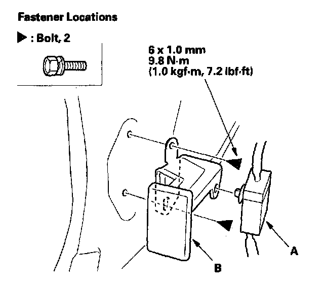 2. Detach the side wire harness connector (A) and remove the bolts, then remove the hood release handle (B).