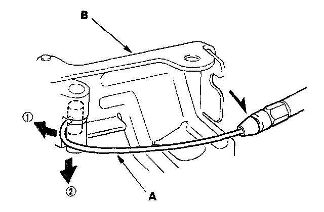 3. Disconnect the hood opener cable (A) from the hood release handle (B). Take care not to bend the cable.