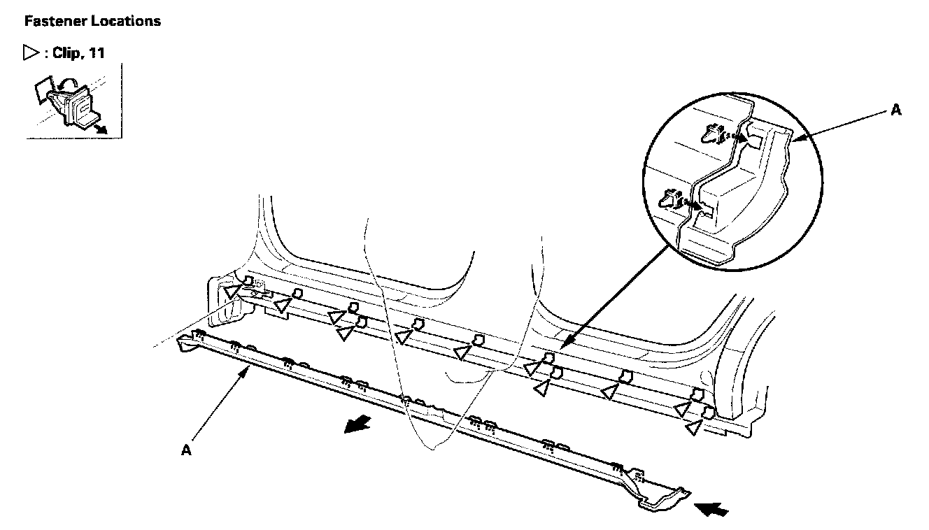 2. Slide the side sill panel (A) forward, and remove it. The side clips will stay in the body.