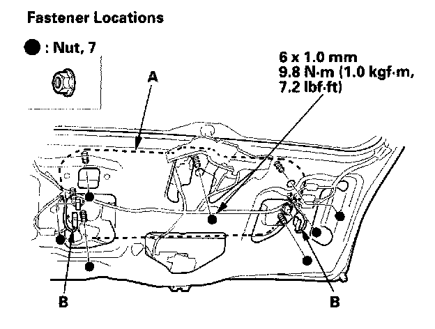 2. From inside the tailgate, remove the nuts securing the rear license trim (A), disconnect the back-up light connectors (B).
