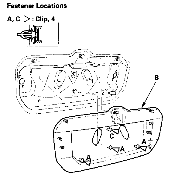 3. From inside the tailgate, release the lower clips (A). Gently close the tailgate, and pull the rear license trim (B) out to detach the upper clip (C), then remove the trim. Take care not to scratch the tailgate.