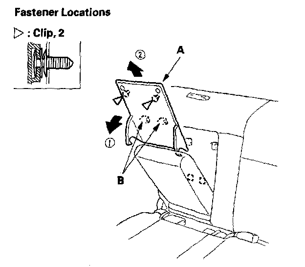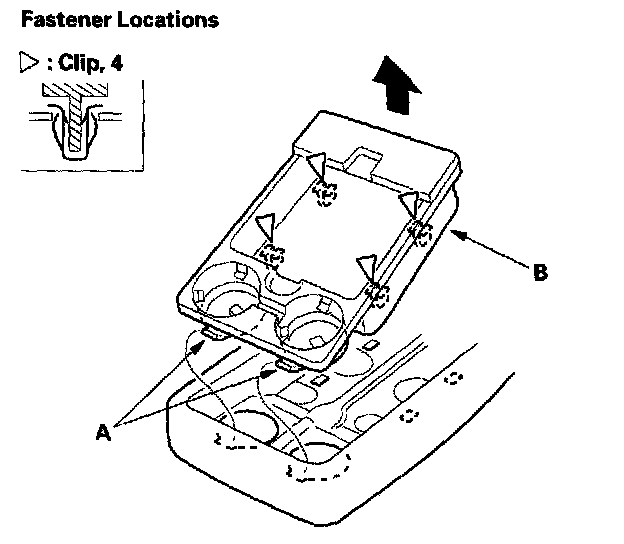 1. Detach the clips of the beverage holder/tray panel (A), then pull the panel upward to release the hooks (B) and remove it.