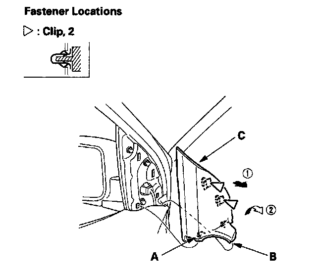 2. Carefully detach the clips, and release the hooks (A, B), then pry out the mirror mount cover (C) by hand in the sequence shown.