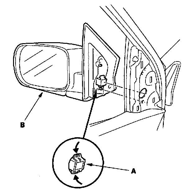 5. While holding the mirror, push in on the connector clips (A), then push out to remove the mirror (B). Take care not to scratch the door.