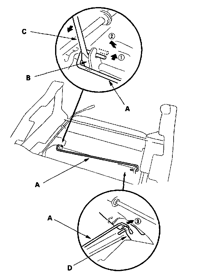 2. Put on gloves to protect your hands. Remove the torsion bar (A) from the hook (B) with a flat-tip screwdriver (C), then pull out the torsion bar from the seat cushion frame (D).