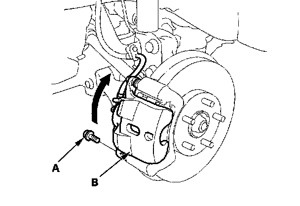 3. Remove the flange bolt (A) while holding the sub pin with a wrench being careful not to damage the pin boot, and pivot the caliper (B) up out of the way. Check the hose and pin boots for damage and deterioration.