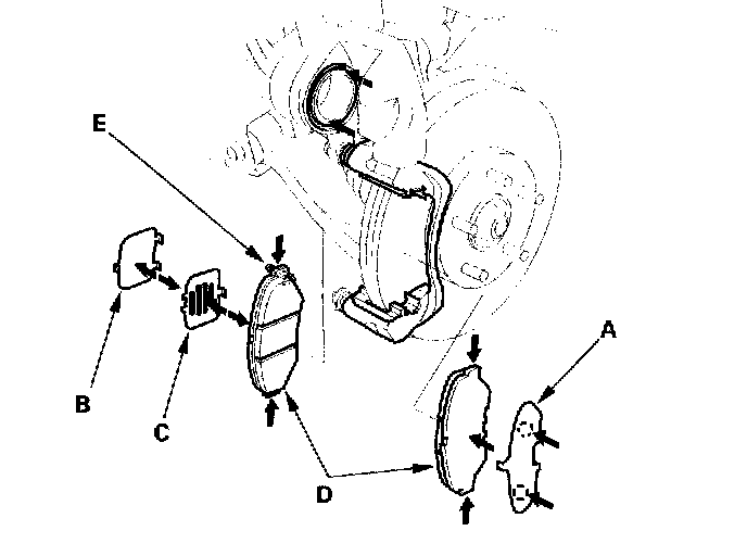 9. Apply Molykote M77 grease (P/N 08798-9010) to the pad side of shim A, B. both sides of shim C, the back of pads (D), and the other areas indicated by the arrows. Wipe excess grease off the shims and pads.