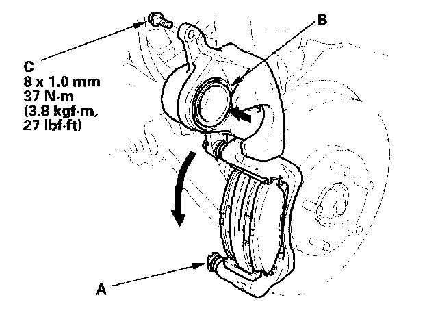 12. Pivot the caliper down into position. Install the flange bolt (C), and torque it to the specified torque while holding the sub pin with a wrench being careful not to damage the pin boot.