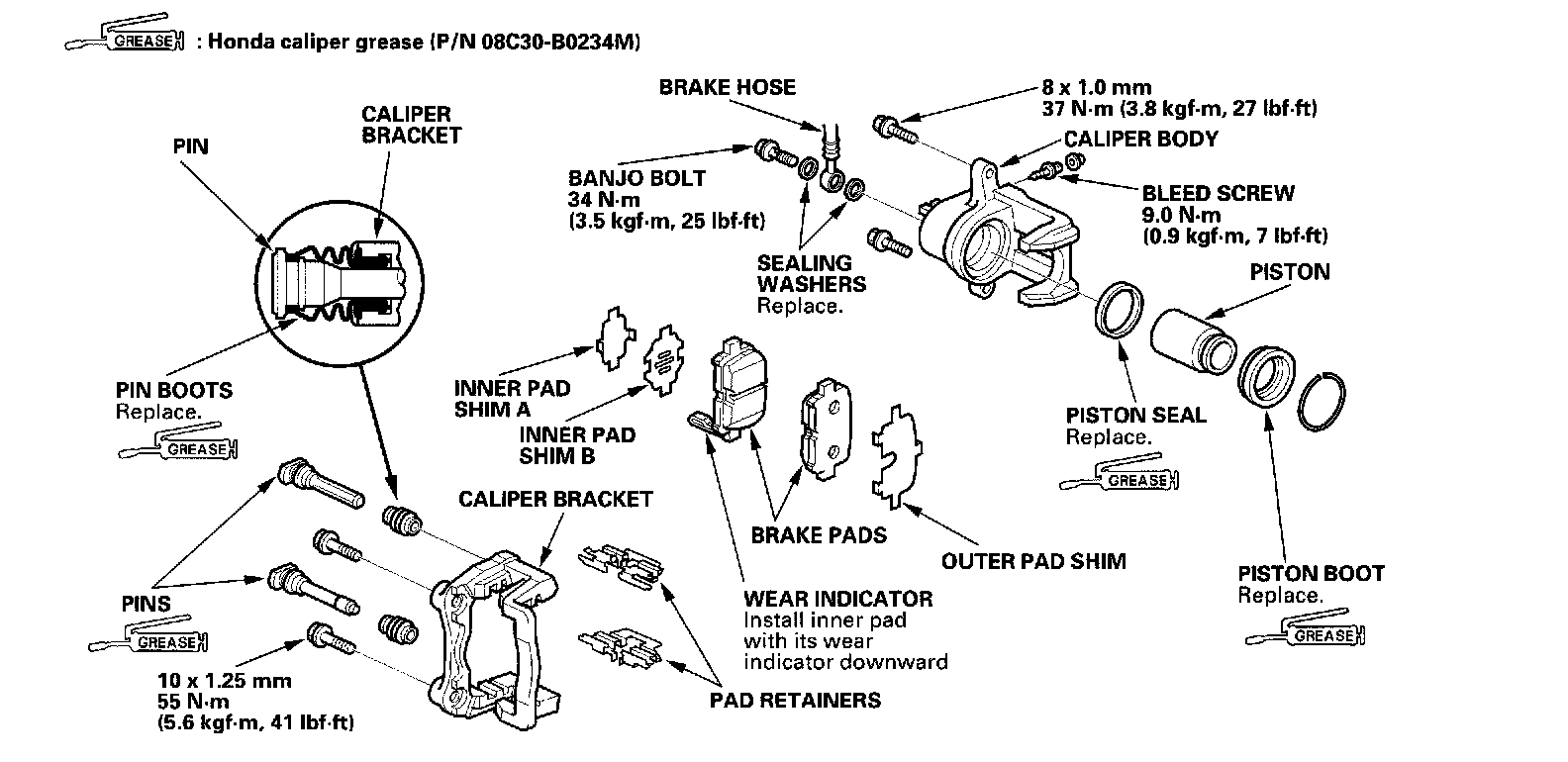 Remove, disassemble, inspect, reassemble, and install the caliper, and note these items: