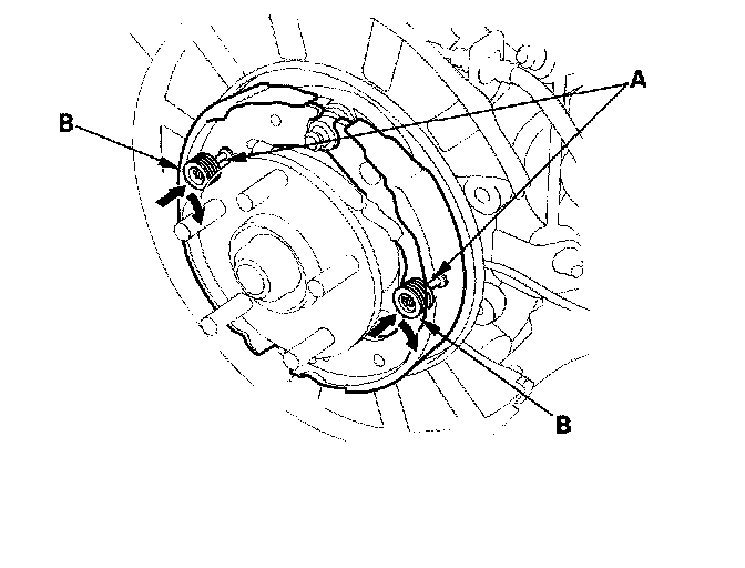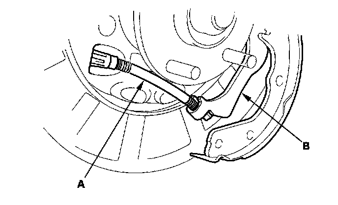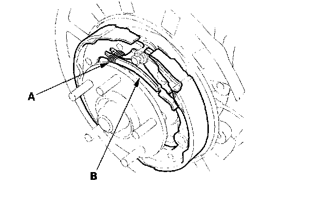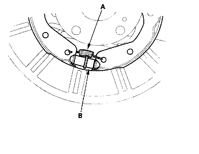 7. Remove the forward brake shoe by removing the lower return spring (A) and adjuster assembly (B).