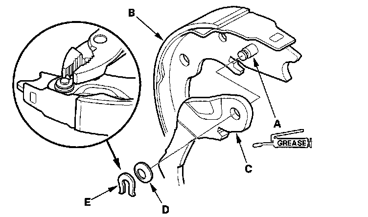 2. Install the parking brake lever (C) and wave washer (D) on the pivot pin, and secure with a new U-clip (E).