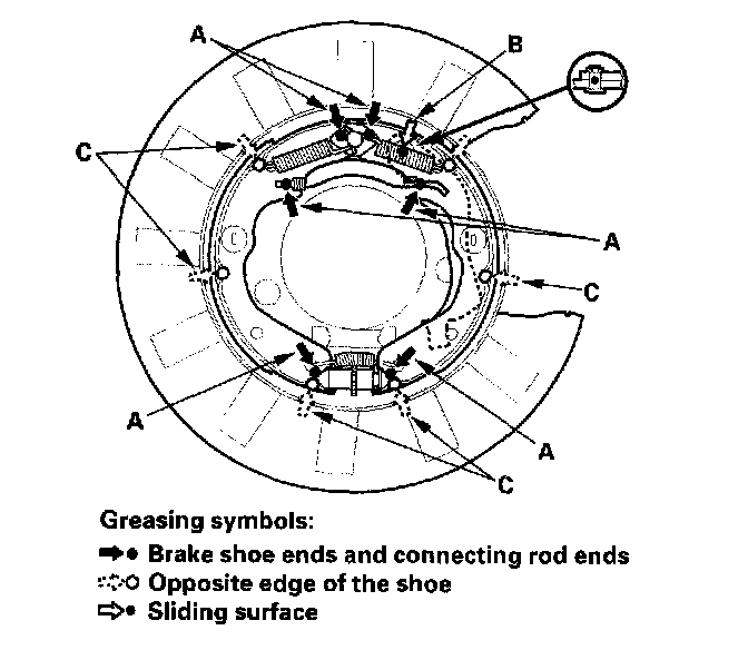 4. Apply Molykote 44 MA grease to the shoe ends and connecting rod ends (A), sliding surfaces (B), and opposite edges of the parking brake shoe (C) as shown. Wipe off any excess. Keep grease off the brake linings.
