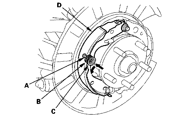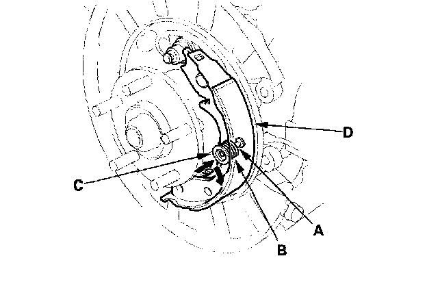 5. Install the tension pin (A), retainer spring (B), and retainer (C) of the rearward brake shoe (D). Make sure the tension pin does not contact to the parking brake lever.