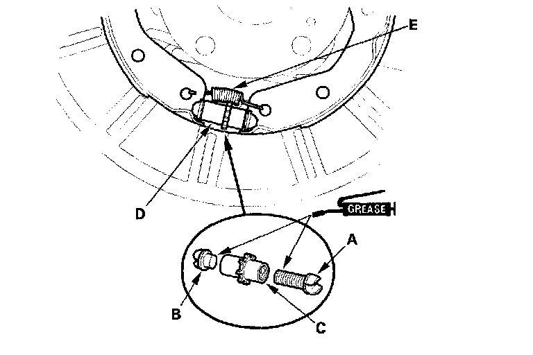 7. Reinstall the brake shoe adjuster assembly (D), and hook the lower return spring (E) on the parking brake shoes.